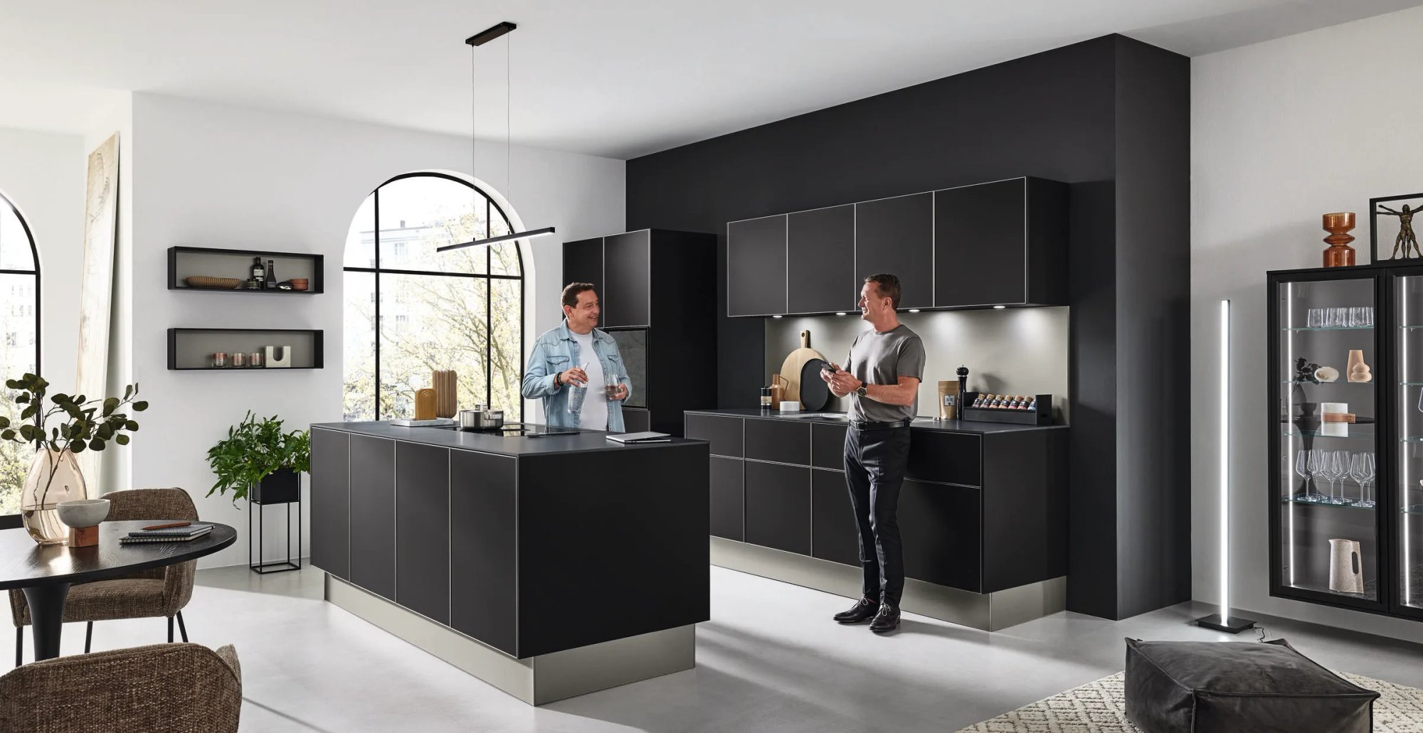 De Ballerina Alu Tec PR 7900 maakt geen compromissen. Diep mat zwart, van vloer tot plafond, van deur tot lade — onderbroken slechts door de slanke aluminium greeplijstjes die langs elke horizontale lijn lopen als een subtiel teken van vakmanschap. Het is een keuken die u herkent aan haar kracht en die u waardeert om haar details. De boogvormige ramen aan de achterwand geven de strakke zwarte setting een onverwacht romantisch karakter.