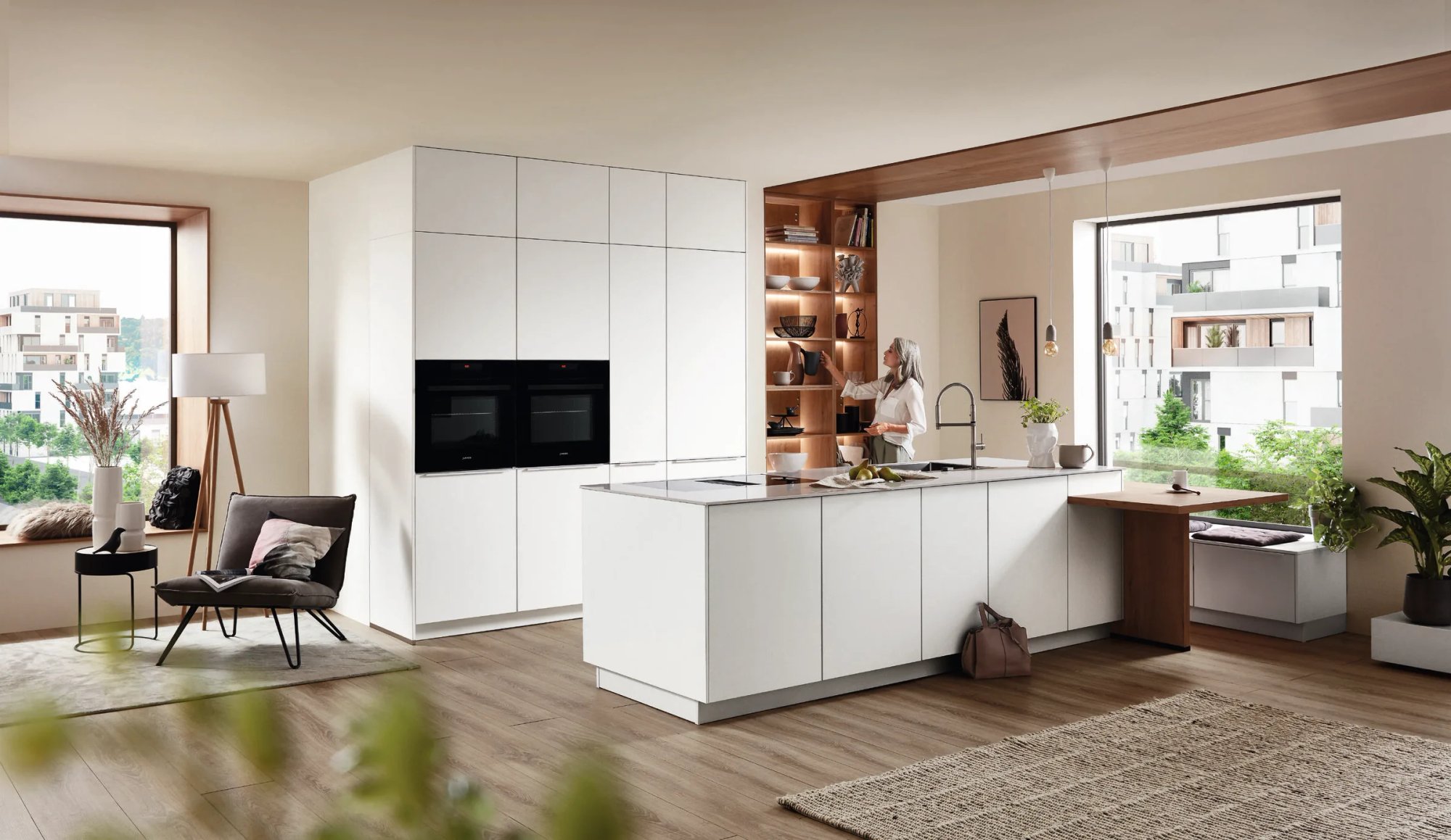In het midden staat het ruime kookeiland, de plek waar u zowel werkt als aanwezig bent. Aan de zijkant bevindt zich een open eiken schappenunit met zachte ingebouwde verlichting: hier staat uw favoriete serviesgoed, verse kruiden en de kleine voorwerpen die u na aan het hart liggen. Naast het grote raam is een geïntegreerde zithoek gebouwd. Een eiken tafel met een bankje, precies goed voor het rustiger moment van de dag, met een kop koffie en het uitzicht over de stad. Eiken loopt als een rode draad door de keuken: vloer, plafondlijst, schappen en tafel ademen allemaal dezelfde warme toon.