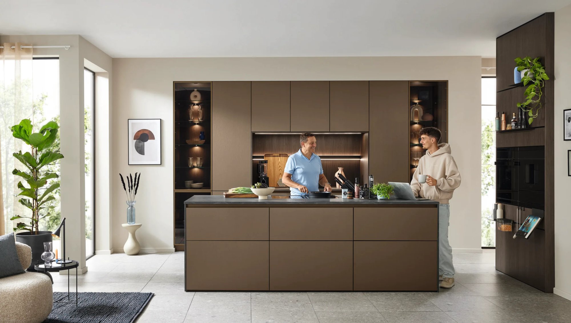 U bent thuis in de keuken die precies bij u past. De Kano 2006 van Ballerina verwelkomt u met warme taupe greeploze fronten, een rustige, aardse toon die toch uitstraalt. Het grote kookeiland staat centraal in de ruimte en nodigt uit: hier kookt u met plezier, terwijl u tegelijkertijd oogcontact houdt met het gezelschap in de woonkamer. Het donkere composiet aanrechtblad geeft het eiland gewicht en karakter, en brengt balans met de warme tint van de kastfronten.