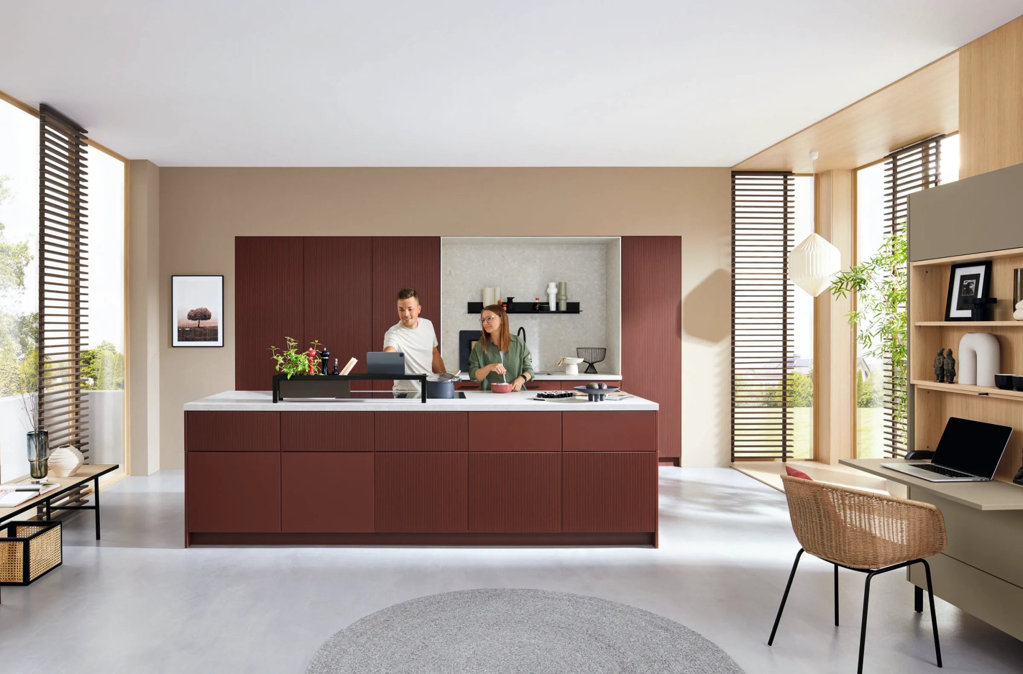 De setting is licht en modern: houten jaloezieën filteren het daglicht zacht de ruimte in, de vloer is strak, de lijnen zijn puur. De bordeaux keuken verdient die rustgevende achtergrond — hij trekt de aandacht vanzelf. Een stel staat er samen aan te koken, ontspannen en geconcentreerd. Dit is hun thuis.