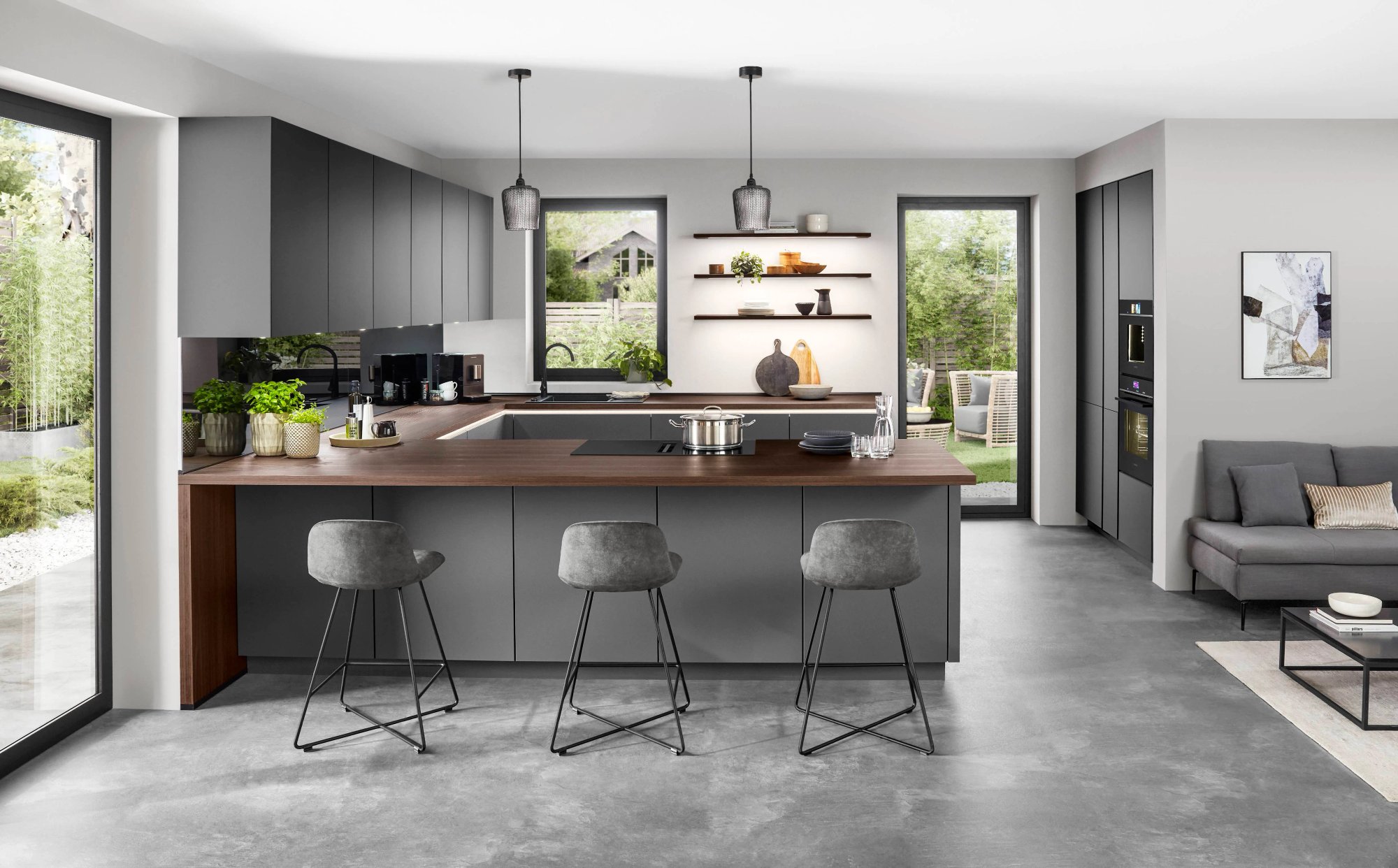 De sfeer treft u meteen. Het antraciet van de greeploze Senso 491 fronten straalt rustige kracht uit, maar het warme walnoot van het werkblad haalt u weer terug naar het vertrouwde. Die combinatie — strak en eigentijds aan de ene kant, warm en uitnodigend aan de andere — maakt deze keuken tot een plek waar u graag naartoe loopt.