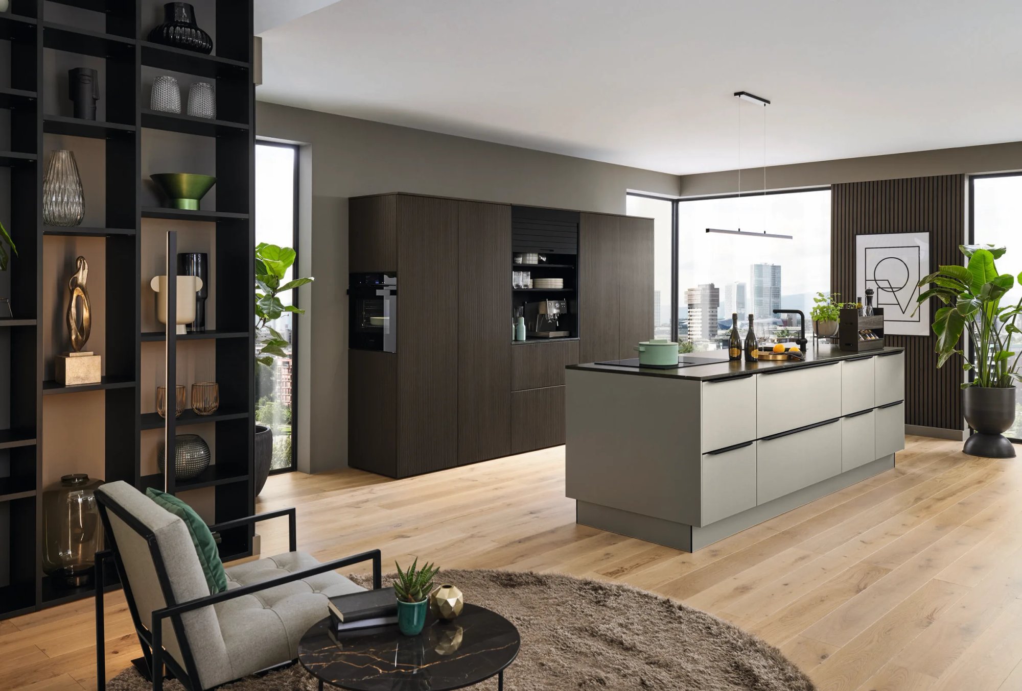De stad als achtergrond, de keuken als middelpunt. Dat is het gevoel dat de Ballerina Talea 8070 Smart M 4681 oproept. Het mat olijfgroene keukeneiland domineert de ruimte met rust en karakter. Geen grepen, geen franjes. De Smart M fronten zijn strak en tijdloos, en de kleur olijfgroen geeft warmte zonder te schreeuwen. Het donkere graniet van het eilandblad versterkt dat gevoel van gedegen kwaliteit.
