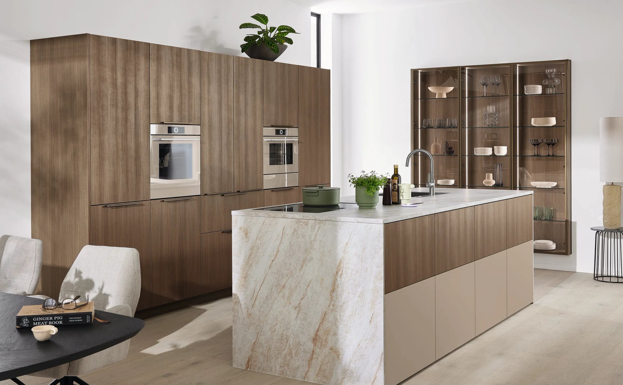 Het kookeiland is het absolute middelpunt: het bovenvlak is bekleed met een dramatisch marmer-look composiet in crème met roze-goud aders, terwijl de onderfronten in mat taupe een rustige, elegante basis vormen. Deze doordachte opbouw — donker hout, zacht taupe, warm marmer — geeft de Top 1751 een rijkdom die u zelden in één keuken aantreft. Aan de zijkant staat een verlichte vitrinekast in donker metalen frame: hier vindt uw mooiste serviesgoed een waardige thuis, altijd zichtbaar en altijd gepresenteerd als kunst.